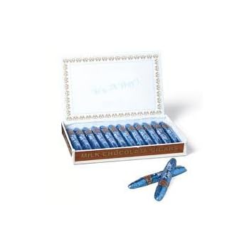 Solid 3/4 oz premium milk chocolate cigars wrapped in blue Italian foil with the traditional band and stork proclaiming 'It's a Boy' printed around the cigar. Each box contains 24 chocolate cigars.