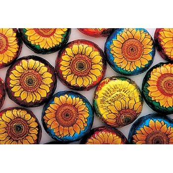 Chocolate Sunflowers: 5LB Small solid milk chocolate balls wrapped in foil that looks like a sunflower!. There are approximately 62 pieces per pound. FLAVOR: Milk Chocolate
