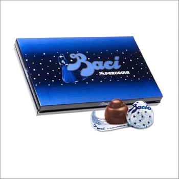 Baci are silky dark chocolates with a heart of creamy blend of milk chocolate and hazelnuts slivers crowned with a whole roasted hazelnut. Each confection is individually wrapped in Baci's signature silver and blue foil and hugged with a poetic love message. Since 1922, the Baci brand has become synonymous with love, romance and Valentines Day. Comes in a stylish blue box of 28 chocolates.