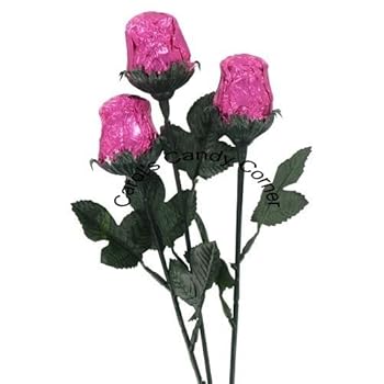 • Roses are 1/2 Oz highly molded chocolate with imprint rose petals chocolate and foil wrapped pink foils, sitting atop 9" stem