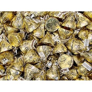 The famous Hershey kisses with fresh almonds inside. These Hershey kisses have wonderful gold wrappers with images of peanuts.