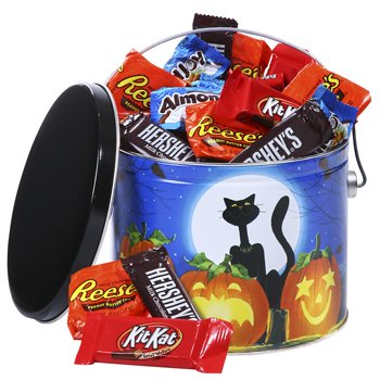 When you think of Halloween, treats, pumpkins and black cats are among the first things that come to mind. Send our Beckoning Black Cat Treat pail full of Halloween Candy in preparation for the holiday. The tin bucket makes a great treat basket for the little trick-o-treaters, and is sturdy enough to be reused year after year. The treats include Reese's Peanut Butter Cups, Hershey's Milk Chocolate Bars, Kit Kat, and Almond Joy.