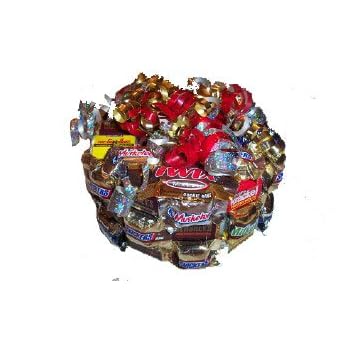 Delicious and Fun Gift! This Medium Size Candy Cake covered with Bite Size candy bars is foam covered with lots of delicious bite size chocolate candies. Cake measures approximately 8 in round by 3.5 in tall. Excellent gift full of lots of chocolate candies.
