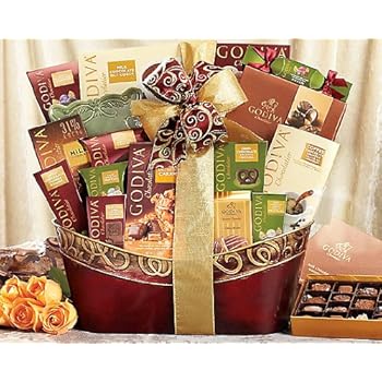 Godiva milk chocolate sea salt toffee caramels, milk and dark chocolate hot cocoa, a complete collection of truffles including dark chocolate, milk chocolate, white chocolate and dark chocolate French vanilla, creme brulee dessert chocolate with layers of butterscotch caramel and vanilla cream in a milk chocolate shell, assorted milk chocolate including a milk chocolate bar, chocolate truffle coffee and smooth, robust Godiva dark chocolate squares with 85% cacao ensure that this decadent gift will make your recipients take a break and indulge. Gift Size: 17" x 7" x 10" - Item 544