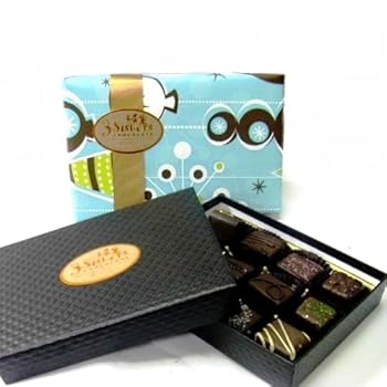 This delectable dark chocolate assortment from 3 Sisters Chocolate includes 12 pieces. Packaged in a delicious Black-Quilted Chocolate Box then wrapped in holiday festive gift wrapping. Includes dark chocolate truffles and caramels. Perfect holiday gift for coworkers and family members.