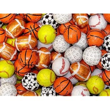 Baseball, Basketball, Soccer, Tennis, Football assorted foil wrapped of chocolate. There are approx: 68 per pound. Tasty candy with your favorite sports balls.